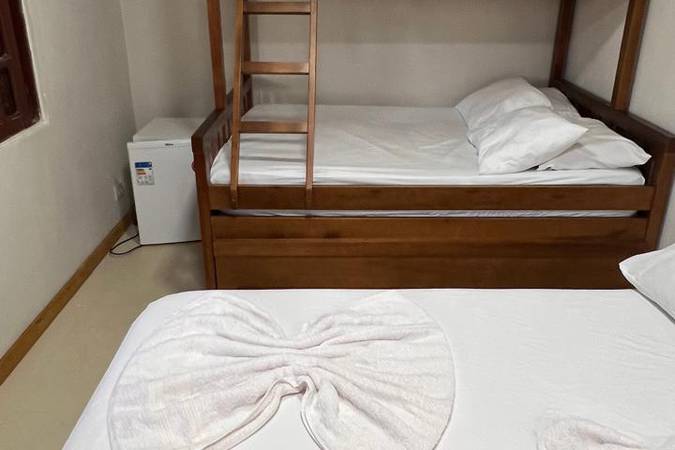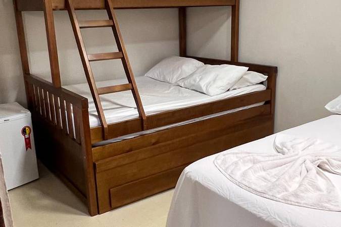 Acomodação perfeita para 05 hóspedes com duas camas casal + beliche com cama solteiro, TV 43” com pacote de canais Vivo TV, varanda com vista para a piscina e as seguintes comodidades: